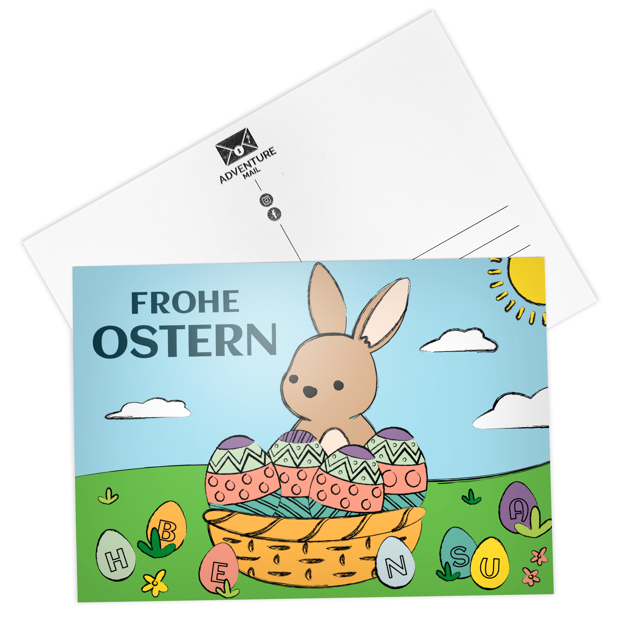 Grusskarte mit Osterhase-Motiv. Die Karte ist eine Rätselkarte – mit dem richtigen Lösungswort erhältst du 10% Rabatt auf die nächste Bestellung.
